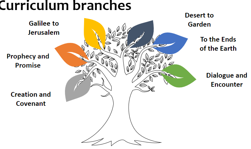 Through their Religious Education lessons, the children explore their faith, the teachings of the Church, and learn to retell and understand key bible stories. From September 2025 the Federation is using the resource ‘The Vine and the Branches’ to ensure coverage of the requirements of the Religious Education Curriculum Directory as set out by the Bishop’s Conference of England and Wales. This ambitious and carefully crafted curriculum covers cyclical themes designed to build on prior knowledge and extend understanding. Each half term, every year group focuses on a particular branch (see diagram). This spiral approach based on the liturgical year, enables the children to build their knowledge at an age-appropriate level. |